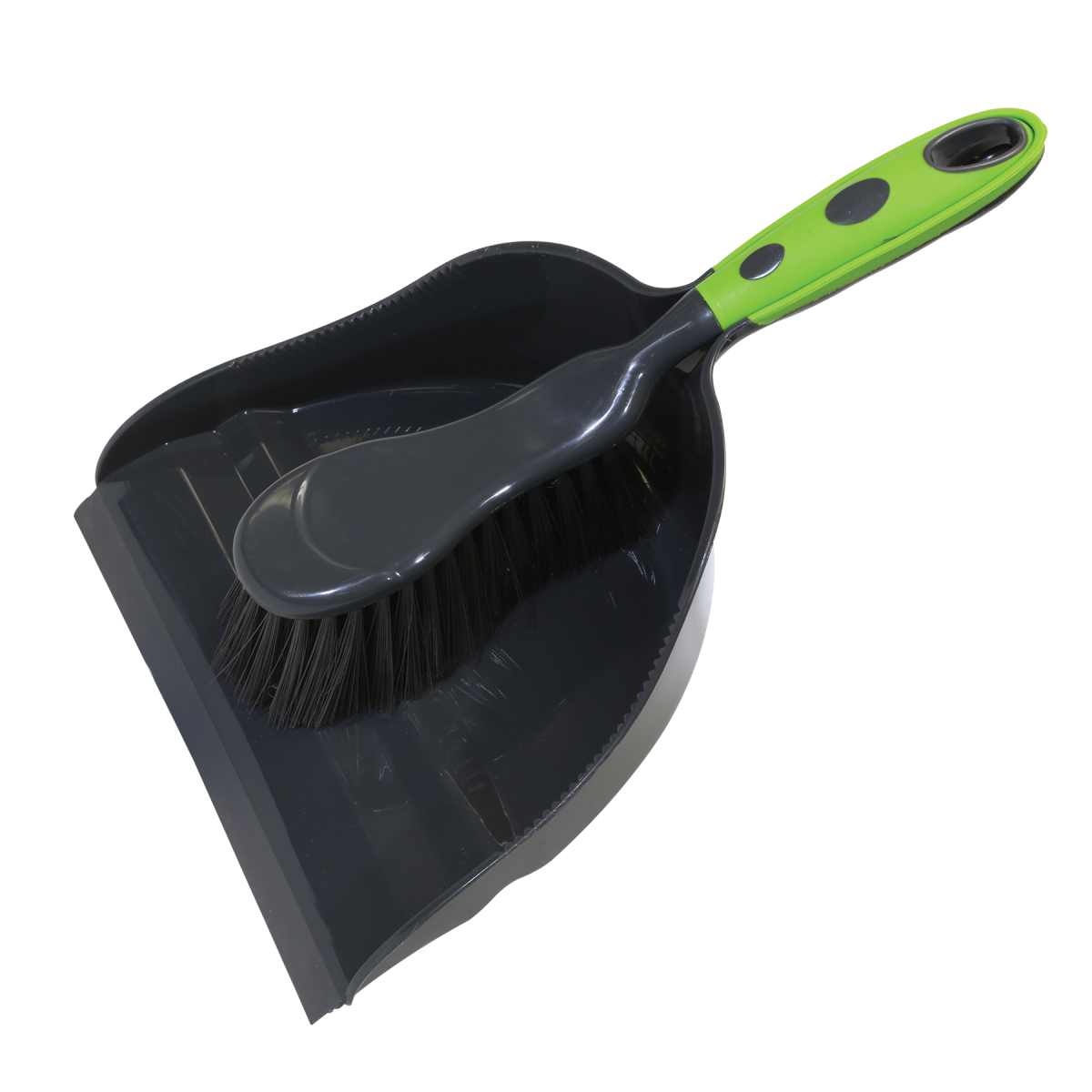 Improved design has polypro bristles and a soft grip, and dust pan is constructed of durable plastic. Handle locks in place and features hanger hole for easy storage.